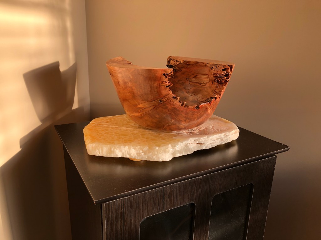 Dick will travel miles for the right block of wood. This 80-something guy acts like a five-year-old on Christmas morning anytime he stumbles across trunks of spalted maple, box elder, ambrosia maple, birch, or red oak. I see firewood. Dick sees a bowl, a cutting board, a platter. His artistic skills spawn the kind of art that is both functional and practical. My home proudly displays a number of his creations.